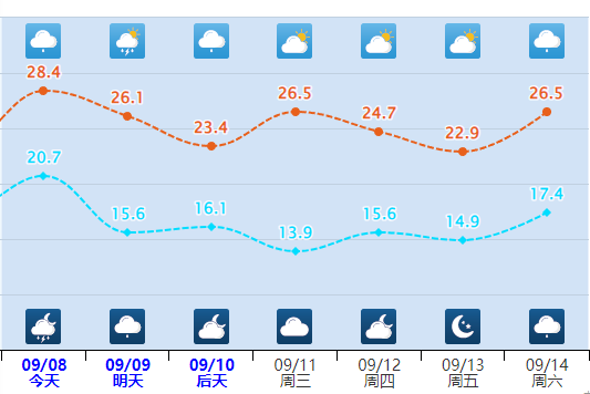 9月12日:全市晴天转多云,局部地区有阵雨或小雨。