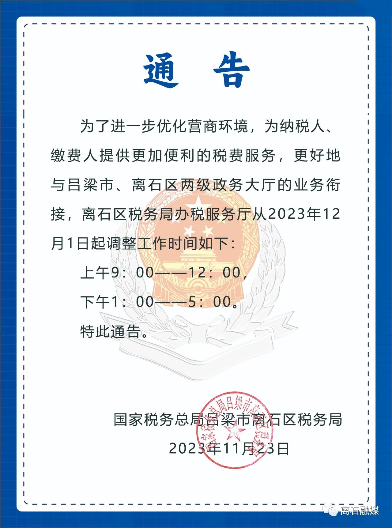 离石区税务局关于办税服务厅调整工作时间的通告