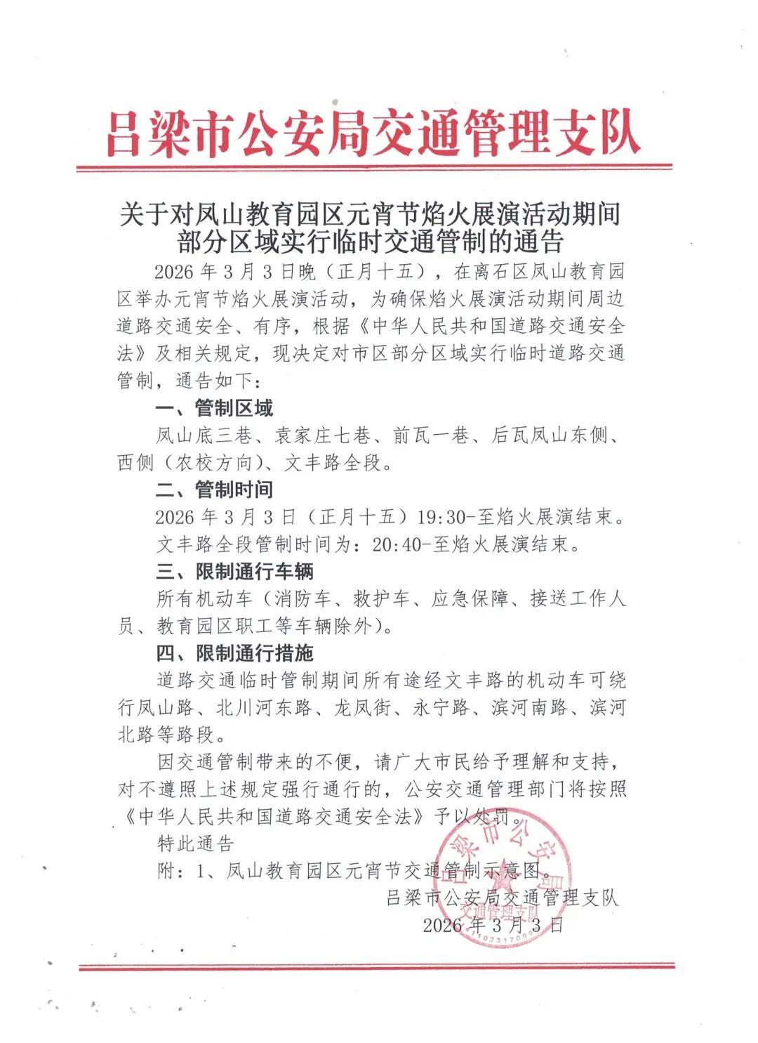 关于对凤山教育园区元宵节焰火展演活动期间部分区域实行临时交通管制的通告