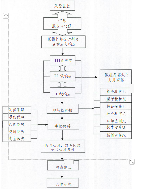 应急措施 | 在做好Ⅱ级响应重点工作基 础上,做好以下工作: 1.认真贯彻落实党中央、国务院领导的指示批示精神; 2.指挥长带领相关成员单位和有关专家到达现场,成立现场指挥部及其工作组,依分工开展事故会商,分析研判事故形势,研究制定事故处置方案和保障方案并组织实施; 3.积极落实相应应急救援工作 | 1.及时派出相关人员、技术专家等赶赴现场,与属地乡镇(街道)、相关单位组成现场工作组,视情形分若干工作组,开展救援等处置工作,依分工开展事故会商,分析研判事故形势,研究制定事故处置方案和保障方案,并组织实施。; 2.进一步做好交通、通讯、医疗、消防、电力等应急保障工作; 3.加强对重要目标物和重大危险源的排查 和安全处置工作,防范次生灾害; 4.加强气象条件服务,视情况调整相应的应急救援工作; 5.落实区委区政府领导的指示批示精神; 6.及时收集、报告相关事故信息,统一信息发布,正确引导舆论报道; 7.做好相关人员安抚工作,保障社会稳定 | 区指挥部按预案规定,派出相关人员、技术专家,给予支持帮助。 1.密切关注事态的发展; 2.加强事故处置信息的收集、分析,提出应对建议; 3.做好应急升级的应对准备 | 区指挥部按预案规定,派出相关人员、技术专 家,给予支持帮助: 1.密切关注事态的发展; 2.加强事故处置信息的收集、分析,提出应对建议; 3.做好应急升级的应对准备 |