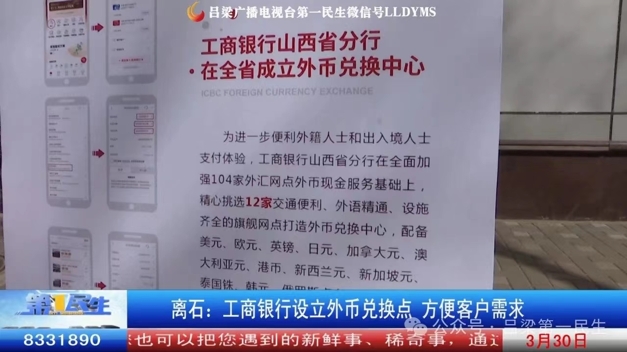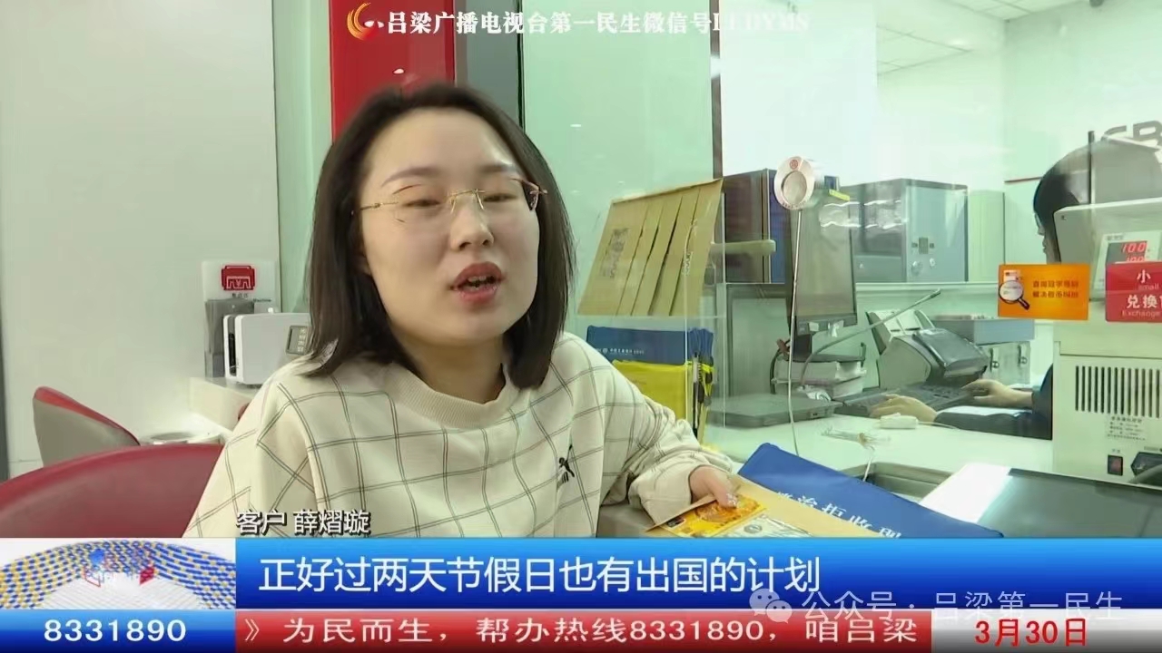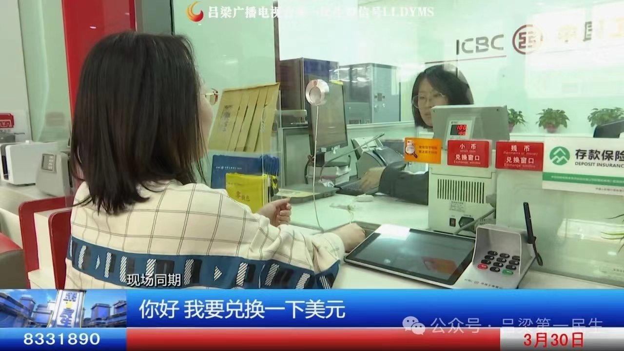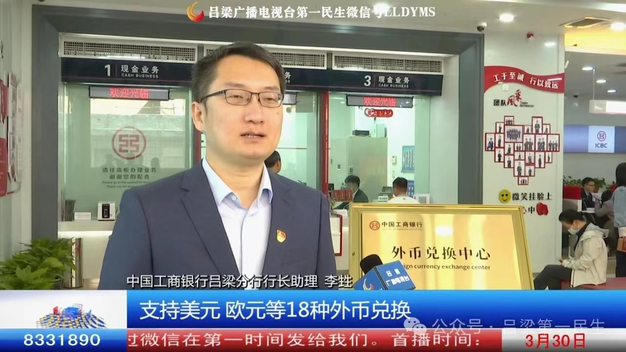 中国工商银行吕梁分行行长助理 李甡:我行精心打造了一家外币兑换中心,支持美元、欧元等18种外币兑换,全面支持线上预约取现,线下即来即兑等外币现钞服务,不断提升外币支付便利。