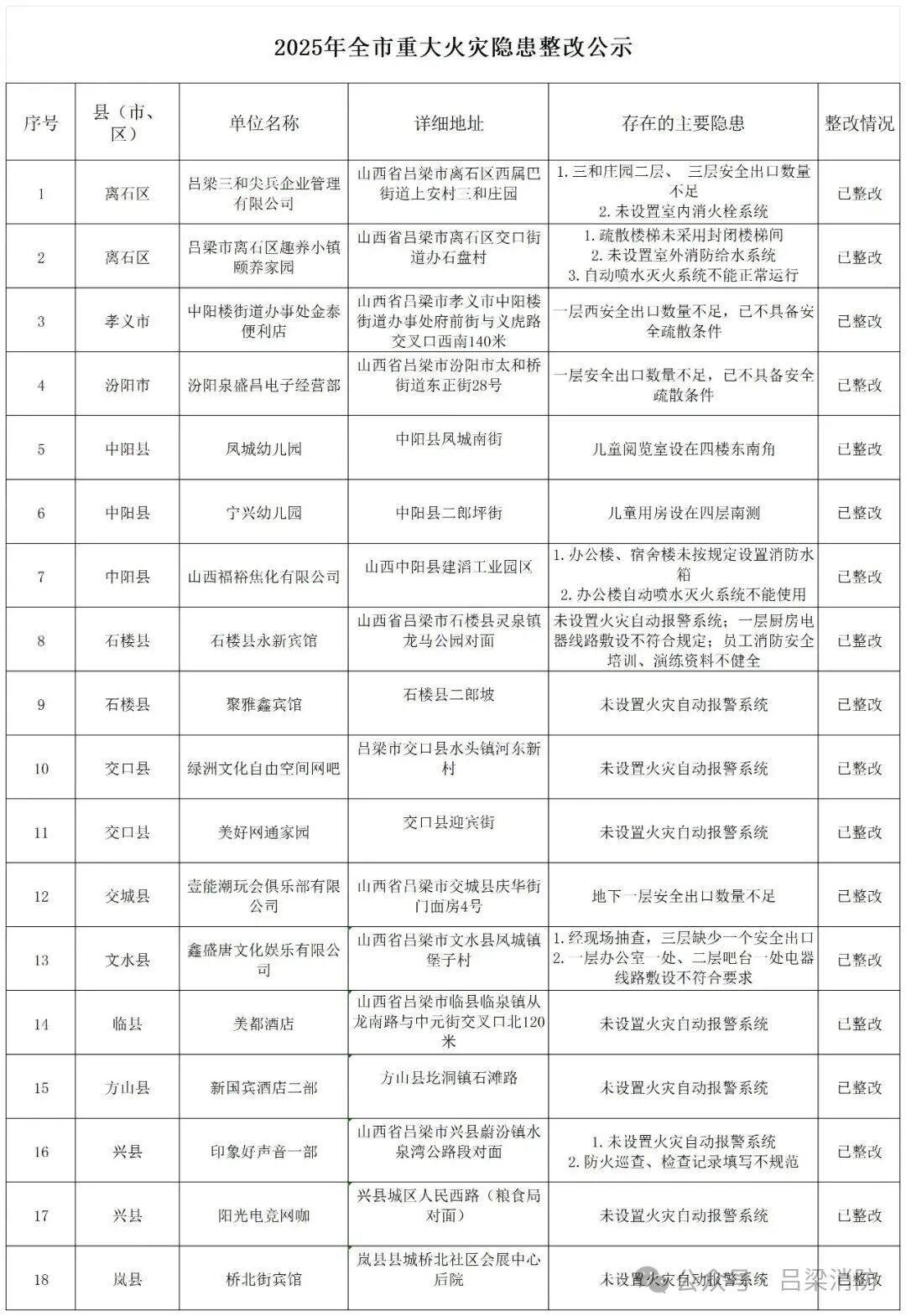 为进一步推动火灾隐患整改,维护消防安全形势稳定,吕梁市消防救援支队对2025年重大火灾隐患单位整改情况进行公示。