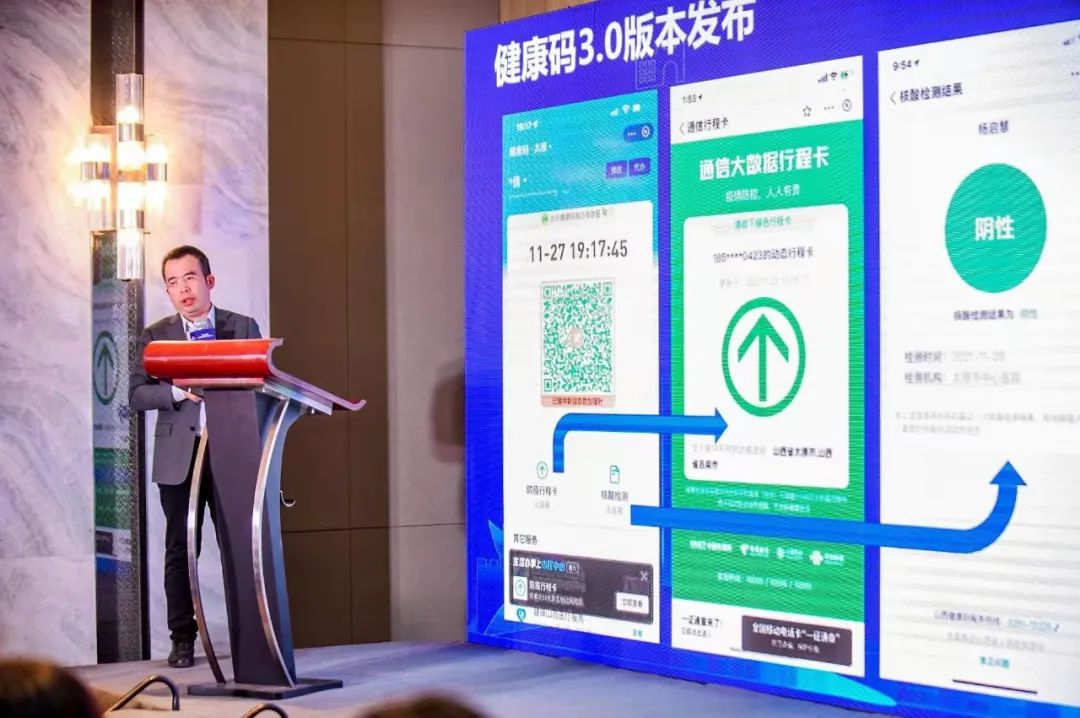 山西省卫健委数字健康指导中心主任王瑞杰为大会宣布新版健康码功能升级正式发布。本次健康码功能升级是结合当下防疫需求,将“健康码”界面与国家“通信大数据行程卡”、核酸检测结果查询融合,方便市民一键点击即可查询。此外,此次升级将进一步精准标识疫苗接种人群,增加加强针接种标识,接种加强针市民可看到健康码更新为“玫瑰金边健康码”。