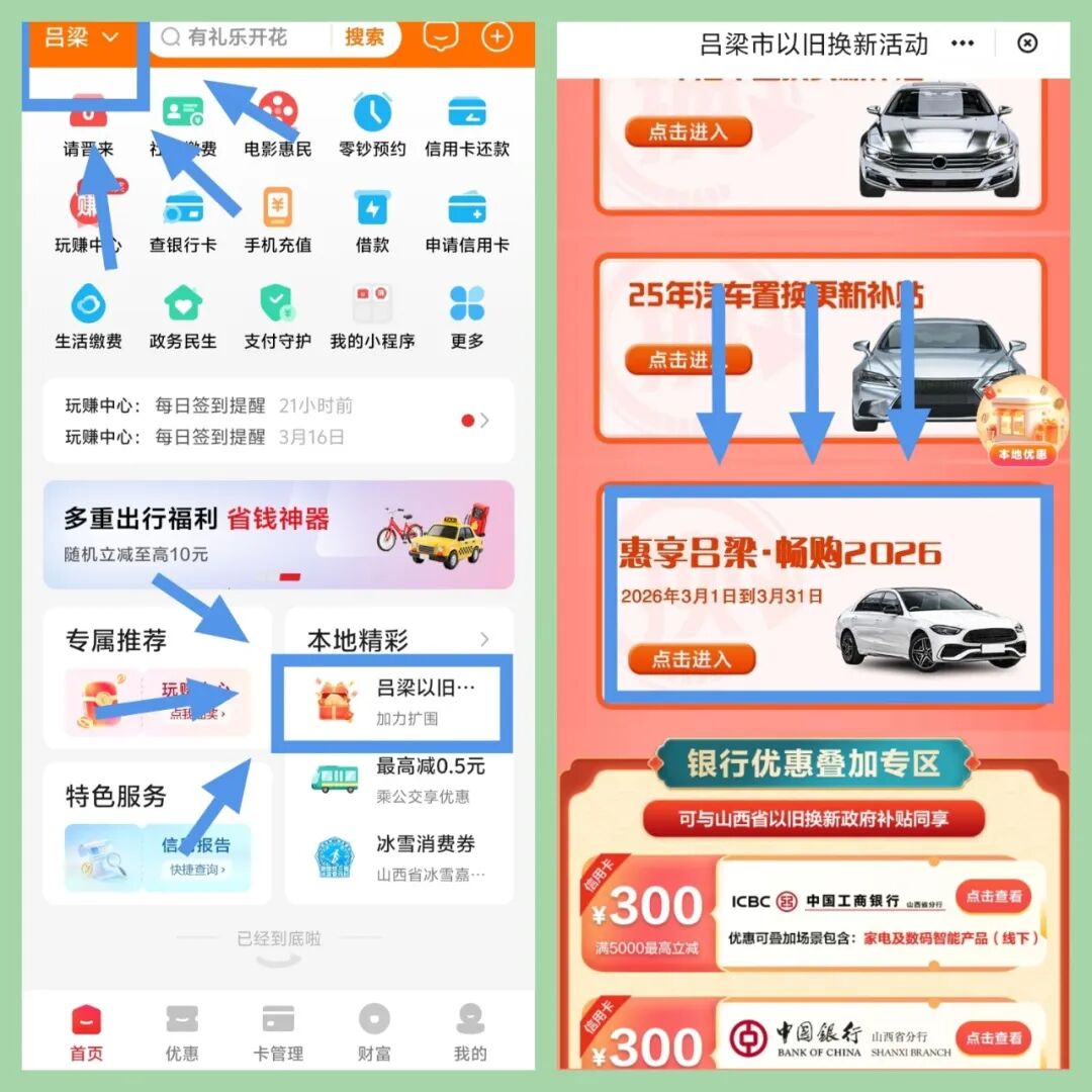 活动期间,符合条件的消费者,登录“云闪付APP”,定位到吕梁,在首页找到“本地精彩”板块,点击“吕梁市以旧换新活动”页面,在该页面下滑,找到并点击进入“惠享吕梁·畅购2026”,完成实名认证后,即可在每轮活动规定的抢券时间内,领取消费券。