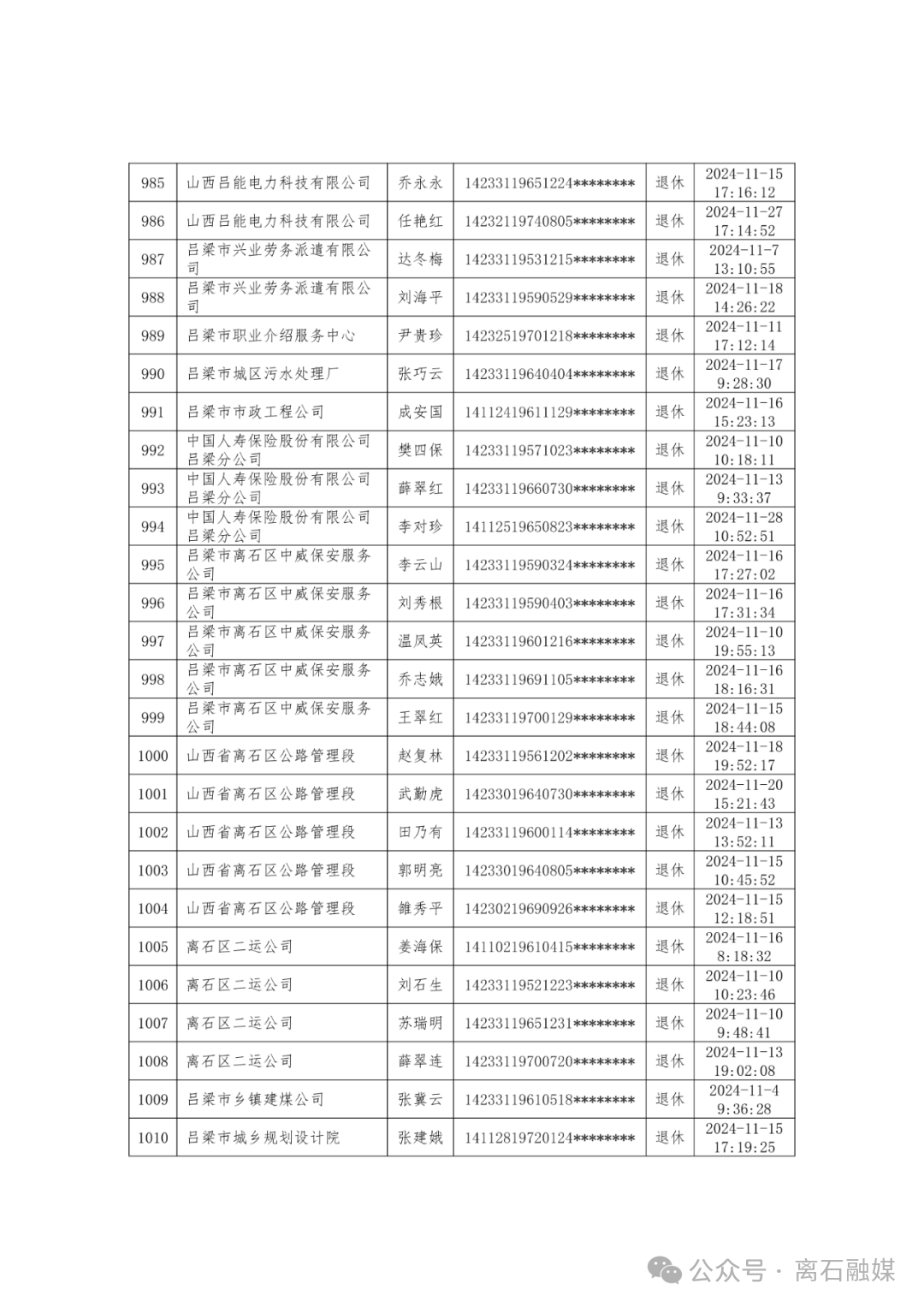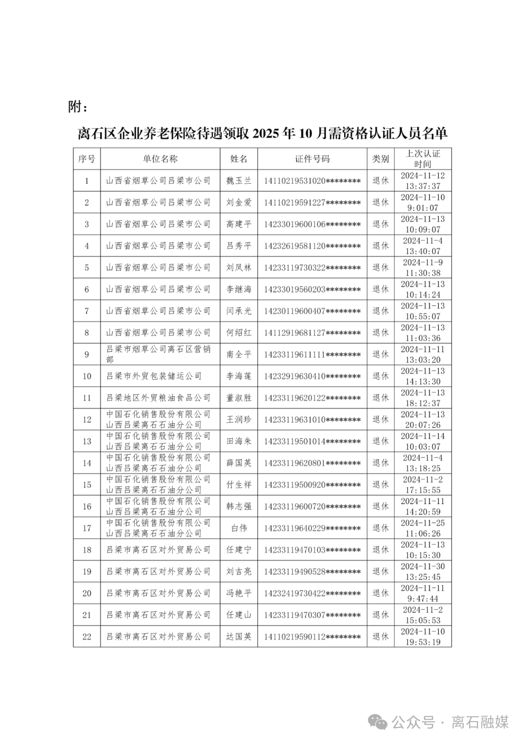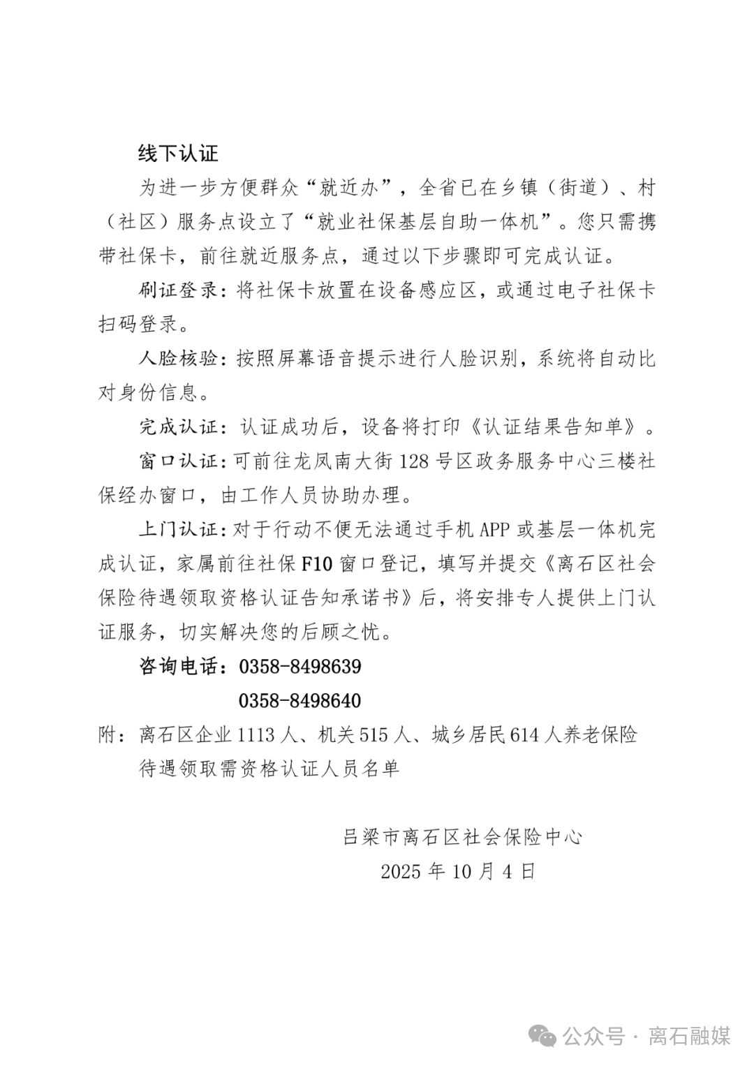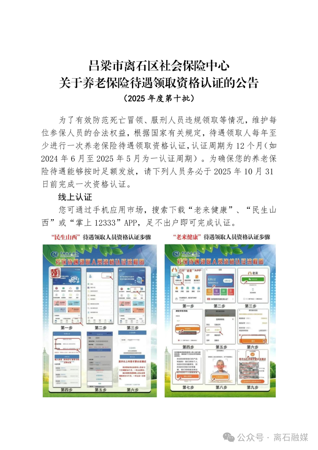 吕梁市离石区社会保险中心关于养老保险待遇领取资格认证的公告(2025年度第十批)