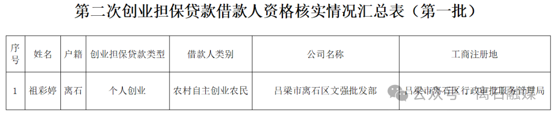 根据《关于转发山西省人力资源和社会保障厅<关于进一步做好创业担保贷款借款人资格核实工作的通知>的通知》(吕人社函〔2020〕254号)文件精神,我中心对离石区第二次申请创业担保贷款借款的祖彩婷1人进行了资格核实,现将已核实的申请创业担保贷款借款人资格的有关信息予以公示,接受社会监督,公示期为5个工作日(2026年1月13日至2026年1月19日)。