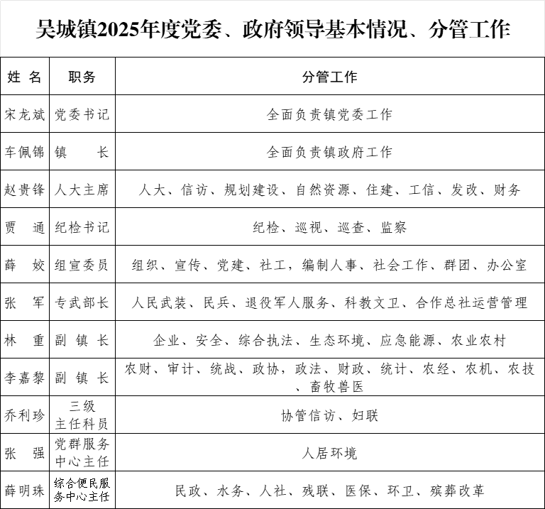 吴城镇党委、镇政府设5个党政机构:党政综合办公室、经济发展办公室、社会事务办公室、规划建设办公室和综合行政执法办公室。