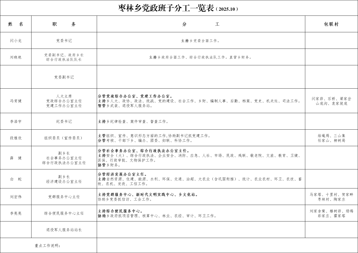 2、全面加强乡(村)党建工作,落实党风廉政建设主体责任 ,抓好组织、宣传、统战、政法工作,深入推进“平安建设”,充分发挥乡党委的领导核心作用、基层党组织的战斗堡垒作用和党员的先锋模范作用,充分发挥监察员作用,进一步推动全面从严治党向基层延伸。负责决定本乡基层党建的重大问题,提升基层党建整体水平。