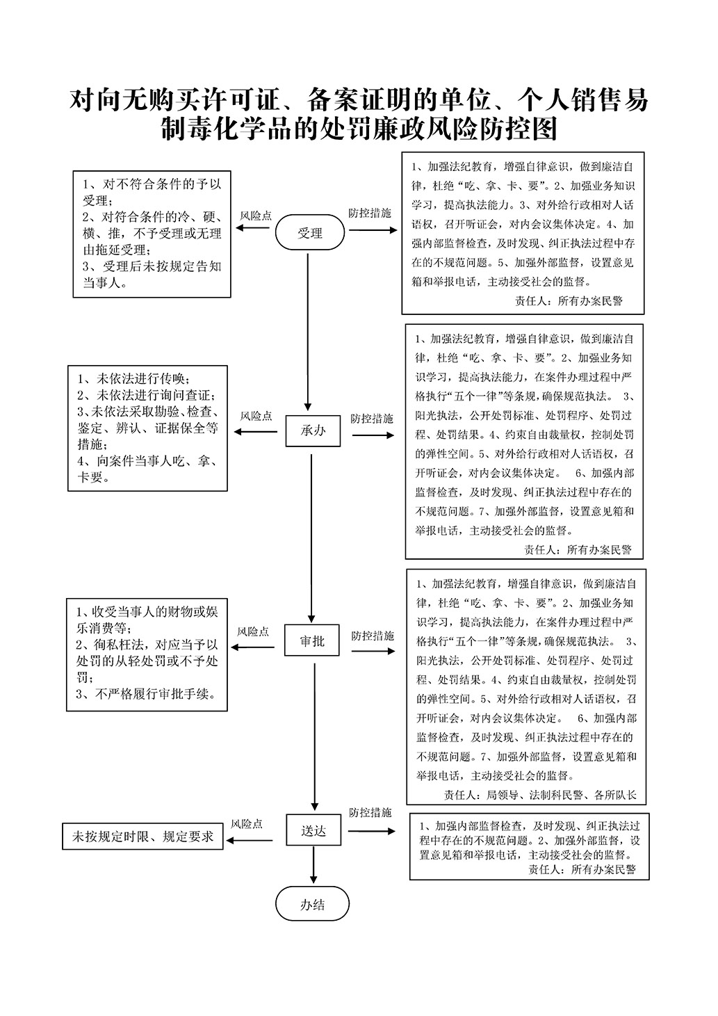 | 行政处罚 | 73193672-6-CF-0159 | 对向无购买许可证、备案证明的单位、个人销售易制毒化学品行为的处罚 | 【规章】《易制毒化学品购销和运输管理办法》(2006年公安部令第87号)第三十一条 | 1、受理责任:报案、控告、举报、群众扭送、主动投案时,审查决定是否予以受理;2、承办责任:对受理的案件,指定专人负责,及时组织调查取证,与当事人有直接利害关系的应回避。办案人员不得少于两人,办案时应当严格遵守执法办案相关规定,允许当事人辩解陈述。办案人员应保守有关秘密。3、审批责任:对办案民警呈送的案件审批,主要对对案件违法事实、证据、调查取证程序、法律适用、处罚种类和幅度、当事人陈述等方面进行审查,提出处理意见(主要证据不足时,以适当的方式补充调查)。4、告知责任:作出行政处罚决定前,应制作《行政处罚告知书》送达当事人,告知违法事实及其享有的 陈述、申辩等权利。5、决定责任:制作行政处罚决定书,载明行政处罚告知、当事人陈述申辩或者听证情况等内容。6、送达责任:行政处罚决定书按法律规定的方式送达当事人。7、执行责任:依照生效的行政处罚决定执行。8、其他法律法规规章文件规定应履行的责任。 | 因不履行或不正确履行职责,有下列情形的,相关工作人员应当承担相应责任: 1、没有法律和事实依据实施行政处罚的;2、行政处罚显失公正的; 3、办案人员玩忽职守,对应当予以制止或处罚的违法行为不予制止、处罚;4、不具备行政执法资格实施行政处罚的;5、在制止以及查处违法案件中有吃拿卡要等行为的;6、应当依法移送追究刑事责任,而未依法移送有权机关的;7、擅自改变行政处罚种类、幅度的;8、违反法定的行政处罚程序的;9、在行政处罚过程中发生腐败行为的;10、其他违反法律法规规章文件规定的行为。 |