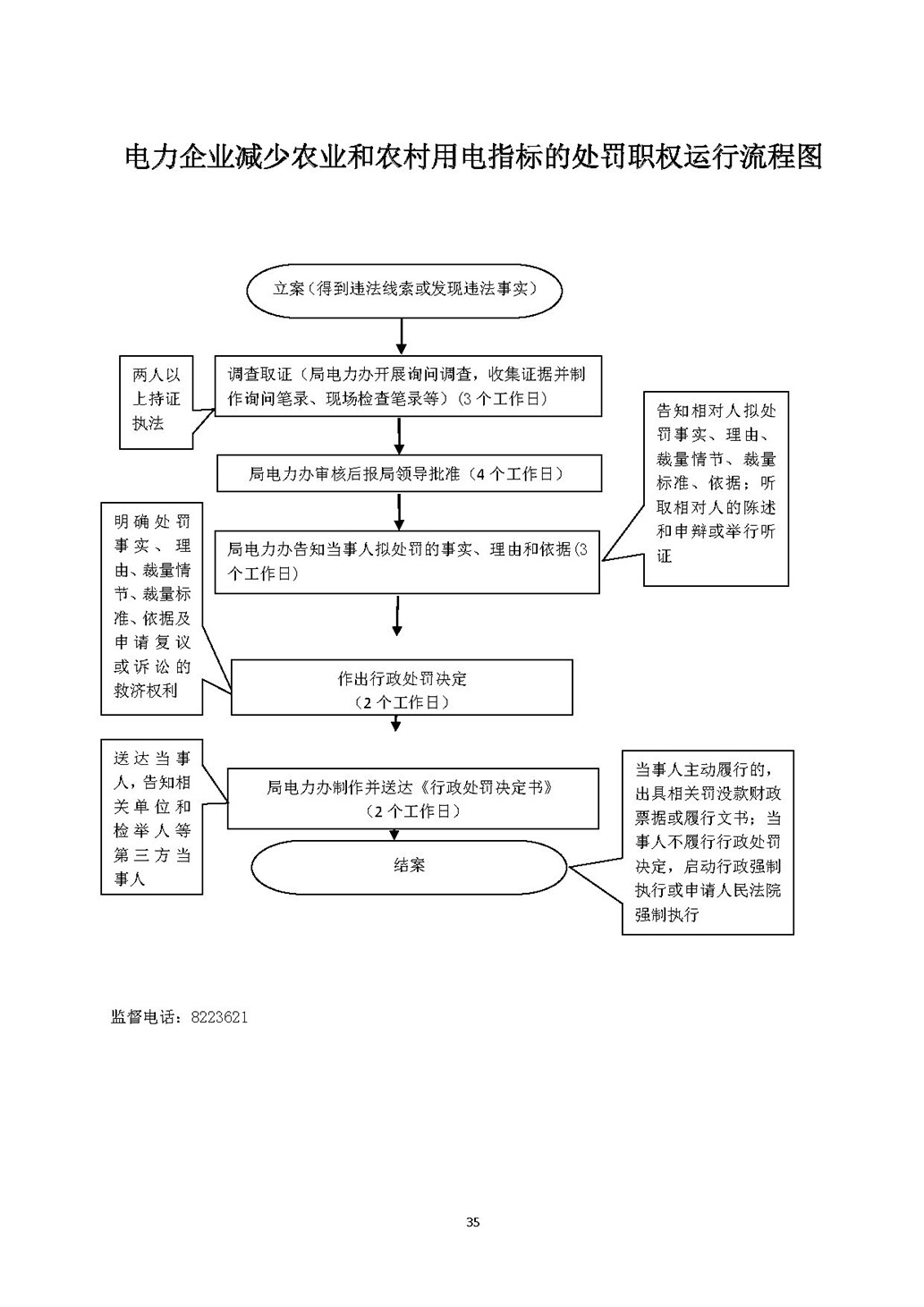 | 行政处罚 | 741051366-CF-0016 | 对电力企业减少农业和农村用电指标的处罚 | 【法律】《中华人民共和国电力法》第四十九条第二款、第六十七条。 | 1、立案责任:根据日常管理中发现或者接到举报、控告的纳税人违法行为案件,予以审查,决定是否立案; 2、调查责任:指定专人负责,对违法行为线索调查取证,有直接利害关系的应当回避;执法人员不得少于两人,调查时应出示执法证件,允许当事人辩解陈述; 3、审查责任:对违法事实、证据、调查取证程序、法律适用、处罚种类和幅度、当事人陈述和申辩理由等进行审查,提出处理意见; 4、告知责任:做出行政处罚决定前,应书面告知当事人违法事实及其享有的陈述、申辩、要求听证等权利; 5、决定责任:制作行政处罚决定书,载明行政处罚告知、当事人陈述申辩或者听证情况等内容; 6、送达责任:将行政处罚决定书送达当事人; 7、执行责任:在处罚决定规定的期限内停止项目建设或生产并进行改造。当事人在法定期限内不申请行政复议或者提起行政诉讼,又不履行处罚决定的,报请同级人民政府责令关闭; 8、其他法律法规规章文件规定应履行的责任。 |