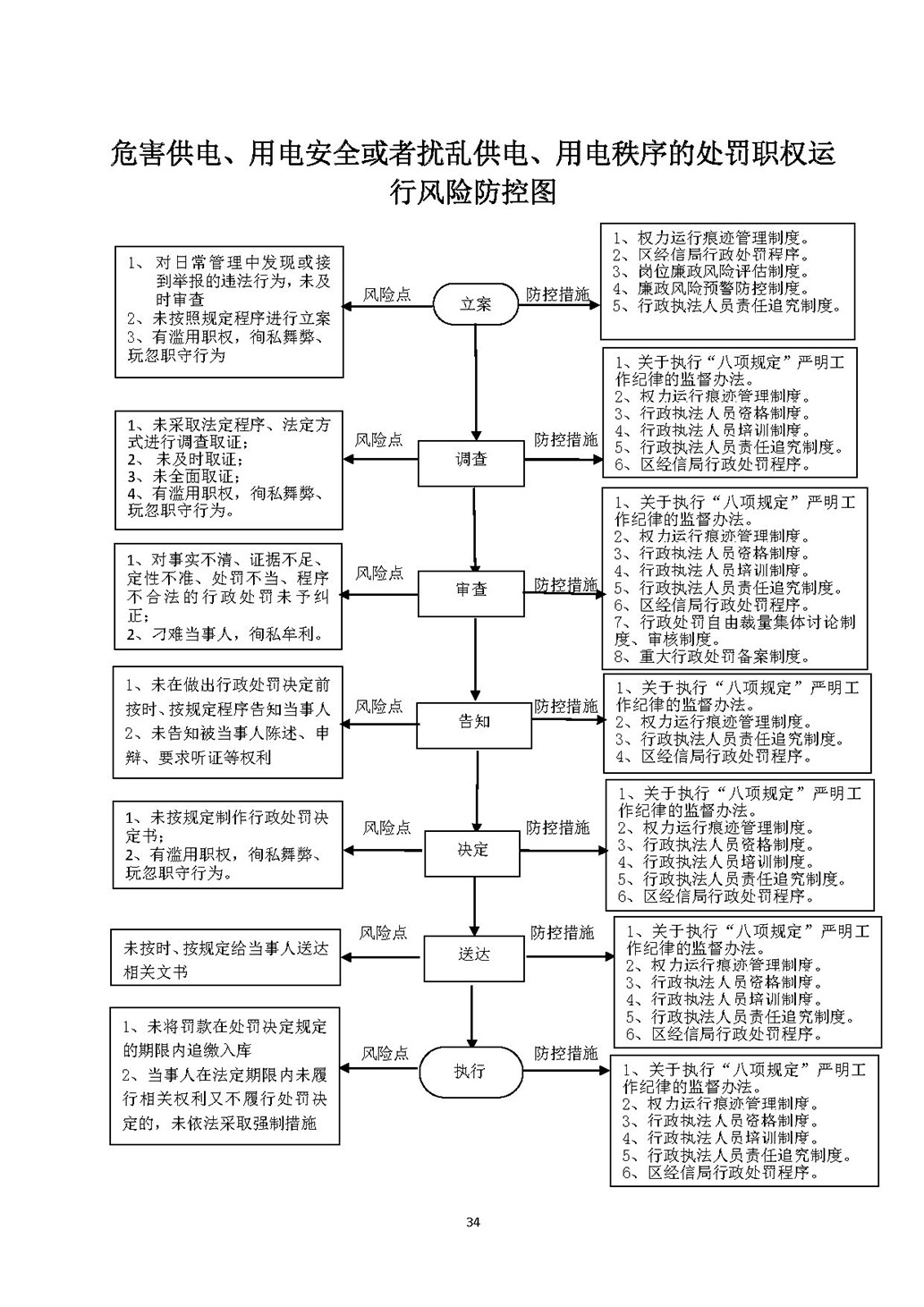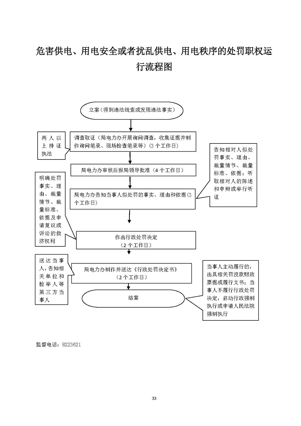 | 行政处罚 | 741051366-CF-0015 | 对危害供电、用电安全或者扰乱供电、用电秩序的处罚 | 【法律】《中华人民共和国电力法》第三十二条、第六十五条。 | 1、立案责任:根据日常管理中发现或者接到举报、控告的纳税人违法行为案件,予以审查,决定是否立案; 2、调查责任:指定专人负责,对违法行为线索调查取证,有直接利害关系的应当回避;执法人员不得少于两人,调查时应出示执法证件,允许当事人辩解陈述; 3、审查责任:对违法事实、证据、调查取证程序、法律适用、处罚种类和幅度、当事人陈述和申辩理由等进行审查,提出处理意见; 4、告知责任:做出行政处罚决定前,应书面告知当事人违法事实及其享有的陈述、申辩、要求听证等权利; 5、决定责任:制作行政处罚决定书,载明行政处罚告知、当事人陈述申辩或者听证情况等内容; 6、送达责任:将行政处罚决定书送达当事人; 7、执行责任:在处罚决定规定的期限内停止项目建设或生产并进行改造。当事人在法定期限内不申请行政复议或者提起行政诉讼,又不履行处罚决定的,报请同级人民政府责令关闭; 8、其他法律法规规章文件规定应履行的责任。 |