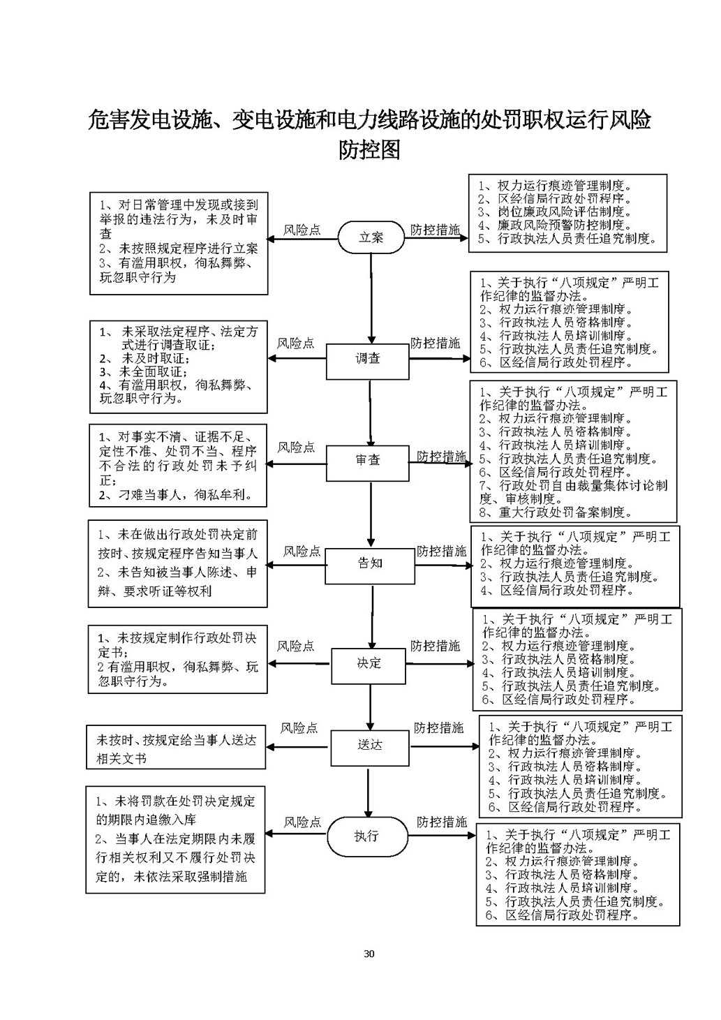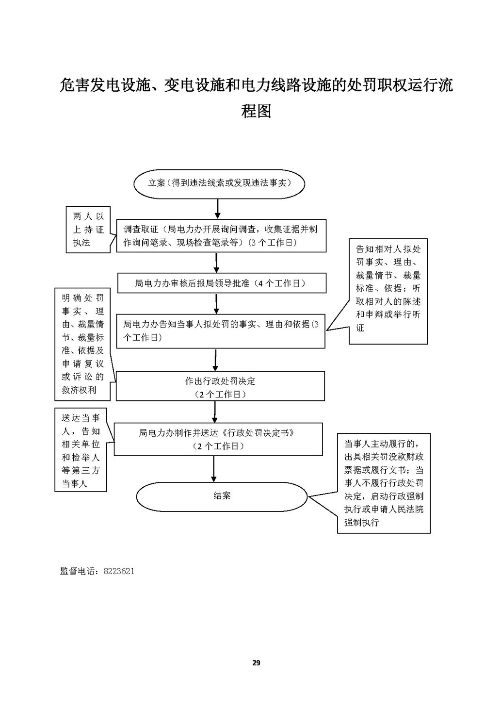 | 行政处罚 | 741051366-CF-0013 | 对危害发电设施、交电设施和电力线路设施的处罚 | 【行政法规】《电力设施保护条例》(第十三条、第十四条、第十五条、第十六条、第十七条、第二十七条(国务院令第239号)。 | 1、立案责任:根据日常管理中发现或者接到举报、控告的纳税人违法行为案件,予以审查,决定是否立案; 2、调查责任:指定专人负责,对违法行为线索调查取证,有直接利害关系的应当回避;执法人员不得少于两人,调查时应出示执法证件,允许当事人辩解陈述; 3、审查责任:对违法事实、证据、调查取证程序、法律适用、处罚种类和幅度、当事人陈述和申辩理由等进行审查,提出处理意见; 4、告知责任:做出行政处罚决定前,应书面告知当事人违法事实及其享有的陈述、申辩、要求听证等权利; 5、决定责任:制作行政处罚决定书,载明行政处罚告知、当事人陈述申辩或者听证情况等内容; 6、送达责任:将行政处罚决定书送达当事人; 7、执行责任:在处罚决定规定的期限内停止项目建设或生产并进行改造。当事人在法定期限内不申请行政复议或者提起行政诉讼,又不履行处罚决定的,报请同级人民政府责令关闭; 8、其他法律法规规章文件规定应履行的责任。 |
