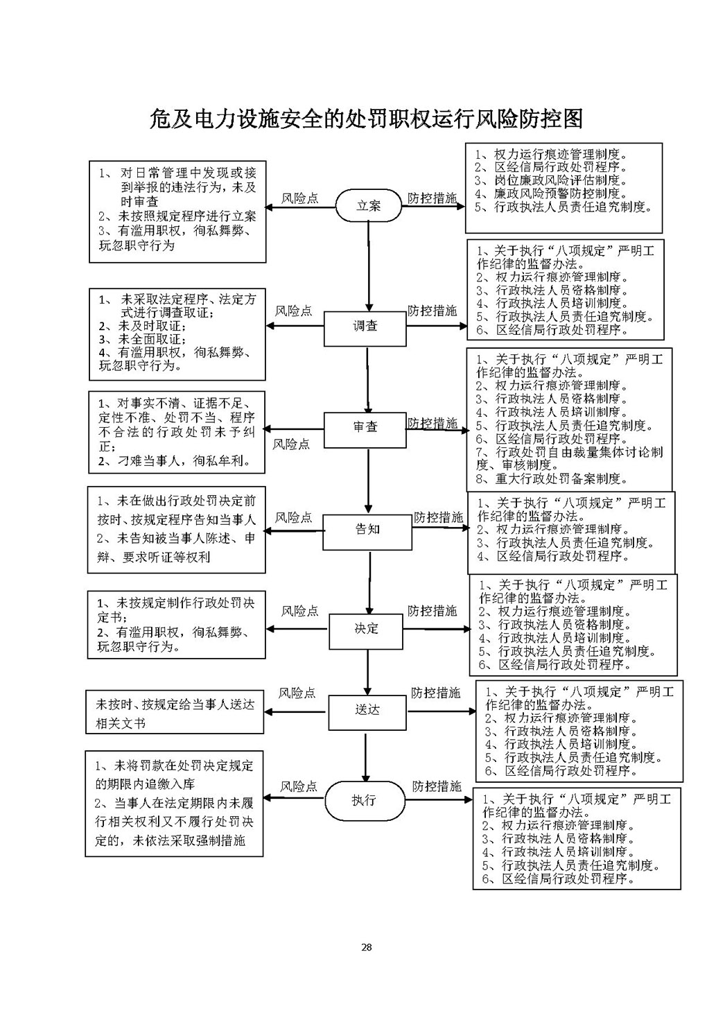 1、立案责任:根据日常管理中发现或者接到举报、控告的纳税人违法行为案件,予以审查,决定是否立案; 2、调查责任:指定专人负责,对违法行为线索调查取证,有直接利害关系的应当回避;执法人员不得少于两人,调查时应出示执法证件,允许当事人辩解陈述; 3、审查责任:对违法事实、证据、调查取证程序、法律适用、处罚种类和幅度、当事人陈述和申辩理由等进行审查,提出处理意见; 4、告知责任:做出行政处罚决定前,应书面告知当事人违法事实及其享有的陈述、申辩、要求听证等权利; 5、决定责任:制作行政处罚决定书,载明行政处罚告知、当事人陈述申辩或者听证情况等内容; 6、送达责任:将行政处罚决定书送达当事人; 7、执行责任:在处罚决定规定的期限内停止项目建设或生产并进行改造。当事人在法定期限内不申请行政复议或者提起行政诉讼,又不履行处罚决定的,报请同级人民政府责令关闭; 8、其他法律法规规章文件规定应履行的责任。 |