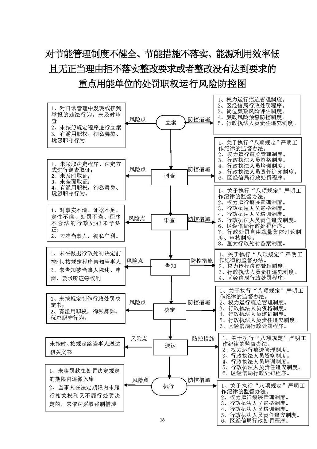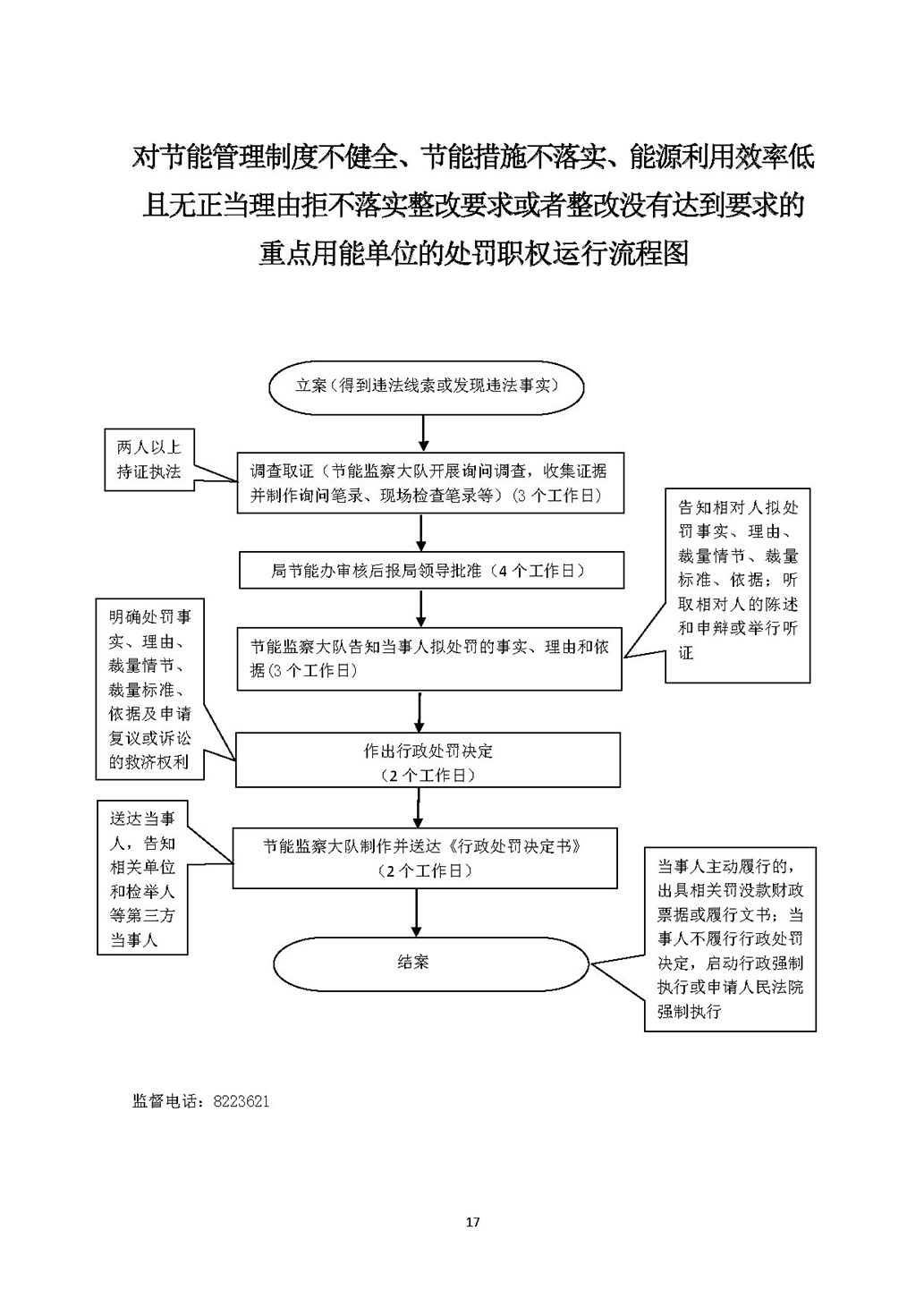 | 行政处罚 | 741051366-CF-0007 | 对节能管理制度不健全、节能措施不落实、能源利用效率低且无正当理由拒不落实整改要求或者整改没有达到要求的重点用能单位的处罚 | 【法律】《中华人民共和国节约能源法》第五十四条、第八十三条。 | 1、立案责任:根据日常管理中发现或者接到举报、控告的纳税人违法行为案件,予以审查,决定是否立案; 2、调查责任:指定专人负责,对违法行为线索调查取证,有直接利害关系的应当回避;执法人员不得少于两人,调查时应出示执法证件,允许当事人辩解陈述; 3、审查责任:对违法事实、证据、调查取证程序、法律适用、处罚种类和幅度、当事人陈述和申辩理由等进行审查,提出处理意见; 4、告知责任:做出行政处罚决定前,应书面告知当事人违法事实及其享有的陈述、申辩、要求听证等权利; 5、决定责任:制作行政处罚决定书,载明行政处罚告知、当事人陈述申辩或者听证情况等内容; 6、送达责任:将行政处罚决定书送达当事人; 7、执行责任:在处罚决定规定的期限内停止项目建设或生产并进行改造。当事人在法定期限内不申请行政复议或者提起行政诉讼,又不履行处罚决定的,报请同级人民政府责令关闭; 8、其他法律法规规章文件规定应履行的责任。 |