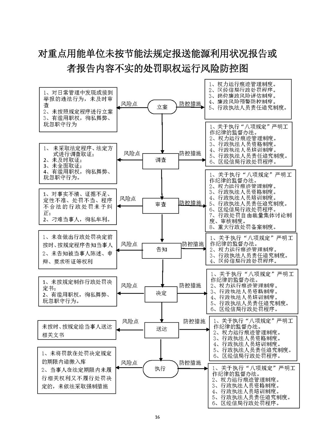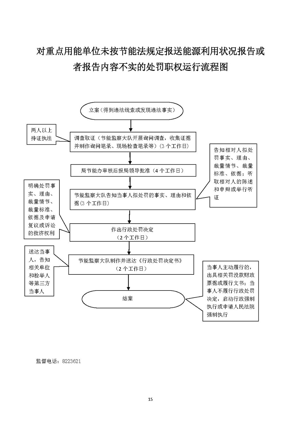 | 行政处罚 | 741051366-CF-0006 | 对重点用能单位未按照节能法规定报送能源利用状况报告或者报告内容不实的处罚 | 【法律】《中华人民共和国节约能源法》第八十二条。 | 1、立案责任:根据日常管理中发现或者接到举报、控告的纳税人违法行为案件,予以审查,决定是否立案; 2、调查责任:指定专人负责,对违法行为线索调查取证,有直接利害关系的应当回避;执法人员不得少于两人,调查时应出示执法证件,允许当事人辩解陈述; 3、审查责任:对违法事实、证据、调查取证程序、法律适用、处罚种类和幅度、当事人陈述和申辩理由等进行审查,提出处理意见; 4、告知责任:做出行政处罚决定前,应书面告知当事人违法事实及其享有的陈述、申辩、要求听证等权利; 5、决定责任:制作行政处罚决定书,载明行政处罚告知、当事人陈述申辩或者听证情况等内容; 6、送达责任:将行政处罚决定书送达当事人; 7、执行责任:在处罚决定规定的期限内停止项目建设或生产并进行改造。当事人在法定期限内不申请行政复议或者提起行政诉讼,又不履行处罚决定的,报请同级人民政府责令关闭; 8、其他法律法规规章文件规定应履行的责任。 |