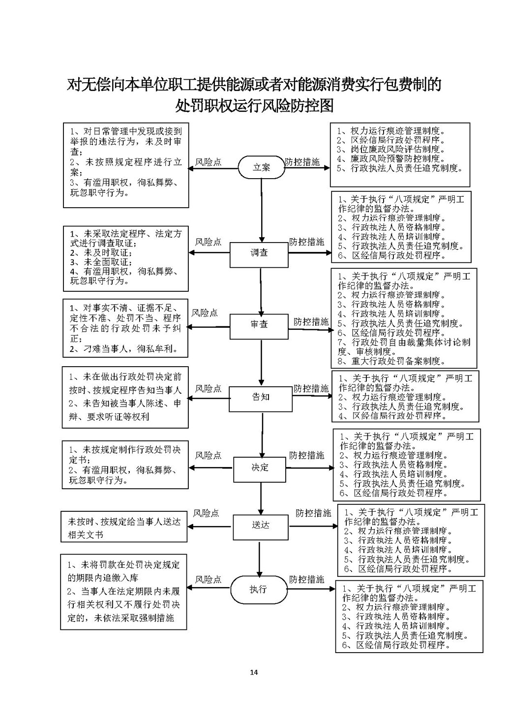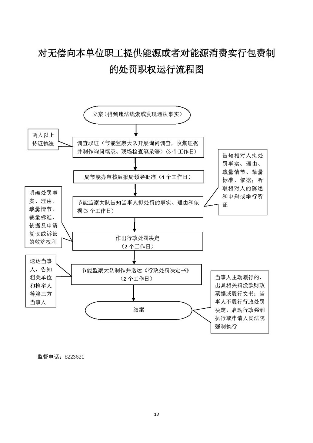 | 行政处罚 | 741051366-CF-0005 | 对无偿向本单位职工提供能源或者对能源消费实行包费制的处罚 | 【法律】《中华人民共和国节约能源法》第七十七条。 | 1、立案责任:根据日常管理中发现或者接到举报、控告的纳税人违法行为案件,予以审查,决定是否立案; 2、调查责任:指定专人负责,对违法行为线索调查取证,有直接利害关系的应当回避;执法人员不得少于两人,调查时应出示执法证件,允许当事人辩解陈述; 3、审查责任:对违法事实、证据、调查取证程序、法律适用、处罚种类和幅度、当事人陈述和申辩理由等进行审查,提出处理意见; 4、告知责任:做出行政处罚决定前,应书面告知当事人违法事实及其享有的陈述、申辩、要求听证等权利; 5、决定责任:制作行政处罚决定书,载明行政处罚告知、当事人陈述申辩或者听证情况等内容; 6、送达责任:将行政处罚决定书送达当事人; 7、执行责任:在处罚决定规定的期限内停止项目建设或生产并进行改造。当事人在法定期限内不申请行政复议或者提起行政诉讼,又不履行处罚决定的,报请同级人民政府责令关闭; 8、其他法律法规规章文件规定应履行的责任。 |
