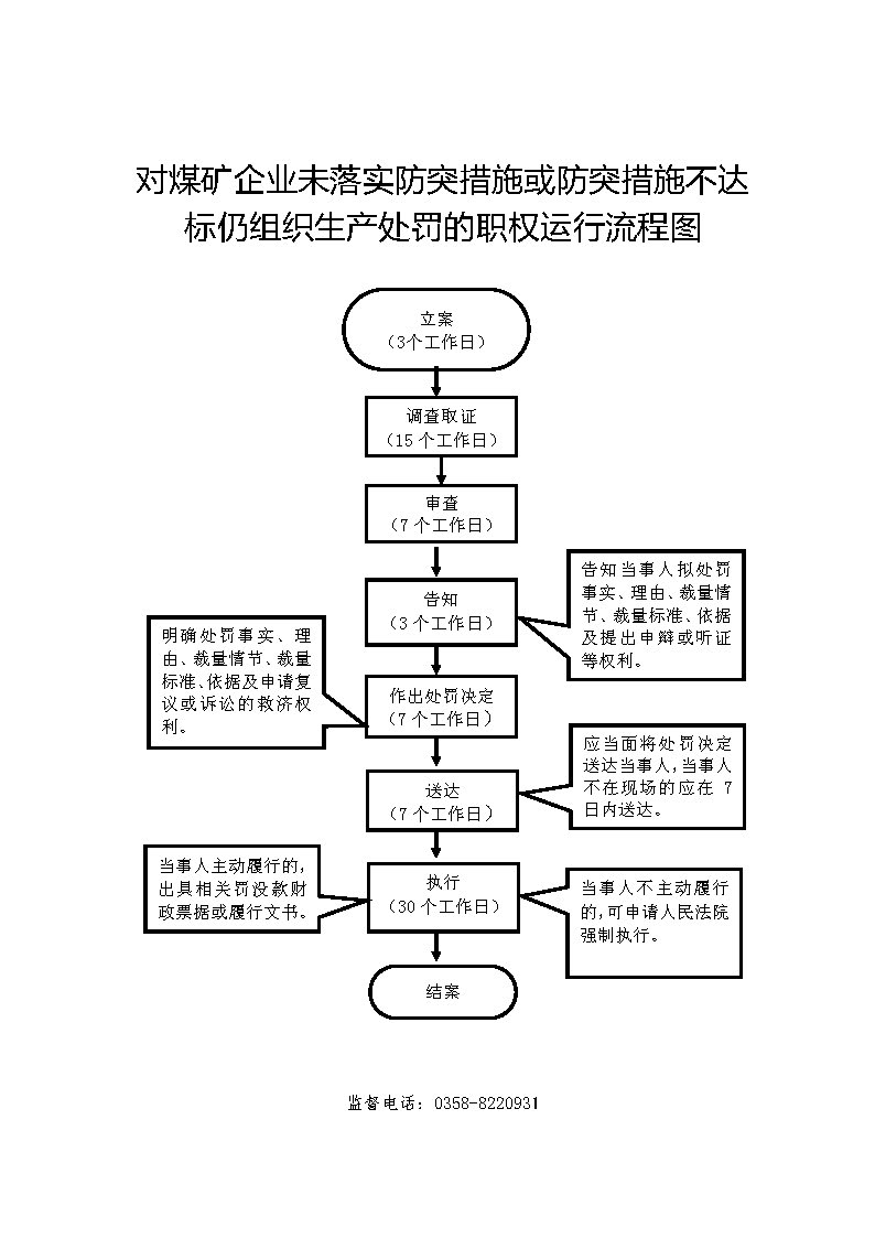 1、立案责任:发现辖区内的煤炭生产经营单位的决策机构、主要负责人或者个人经营的投资人不依照本法规定保证安全生产所必需的资金投入,致使生产经营单位不具备安全生产条件的违法行为(或者下级煤炭管理部门上报或其他机关移送的违法案件等),应及时予以审查,决定是否立案。 2、调查责任:煤炭管理部门对立案的案件,指定专人负责,及时组织调查取证,执法人员应保守有关秘密。 3、审查责任:审理案件调查报告,对案件违法事实、证据、调查取证程序、法律适用、处罚种类和幅度、当事人陈述和申辩理由等方面进行审查,提出处理意见(主要证据不足时,以适当的方式补充调查)。 4、告知责任:作出行政处罚决定前,应制作《行政处罚告知书》送达当事人,告知违法事实及其享有的陈述、申辩等权利。符合听证规定的,制作并送达《行政处罚听证告知书》。 5、决定责任:制作行政处罚决定书,载明行政处罚告知、当事人陈述申辩或者听证情况等内容。 6、送达责任:行政处罚决定书按法律规定的方式送达当事人。 7、执行责任:依照生效的行政处罚决定,监督当事人履行。当事人逾期不履行的,可依法采取加处罚款、申请法院强制执行8、其他法律法规规章文件规定应履行的责任。 |