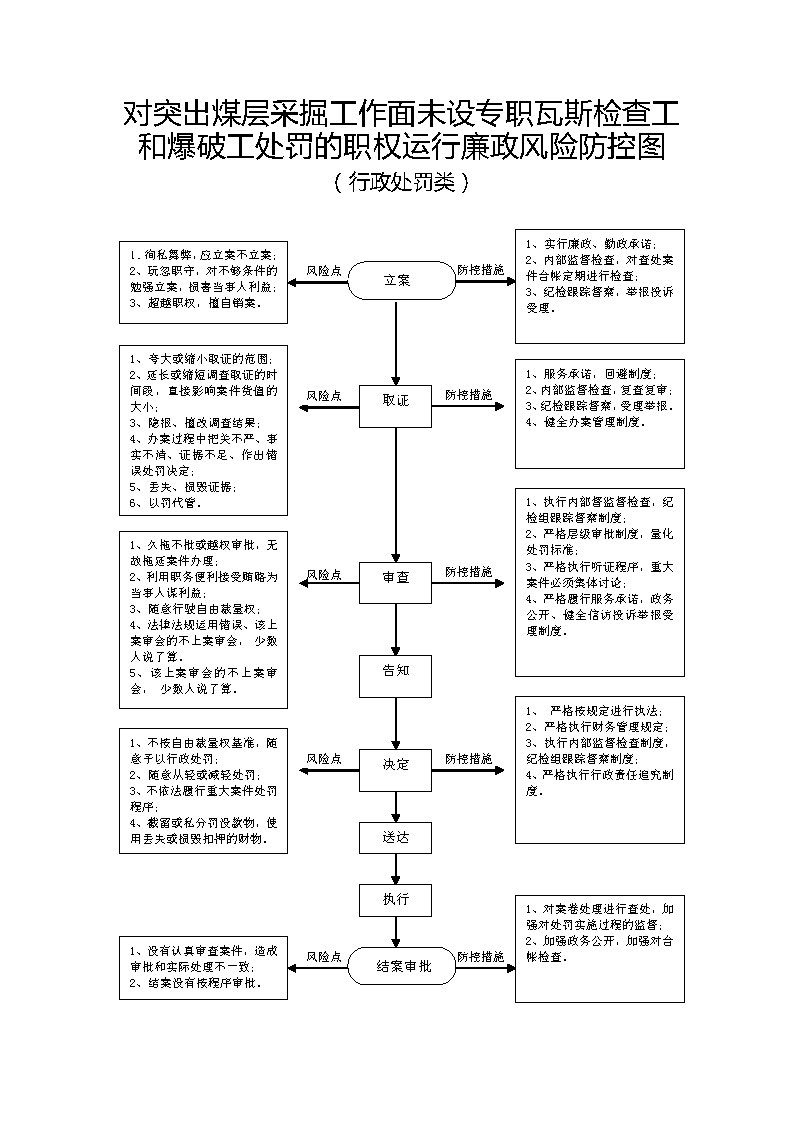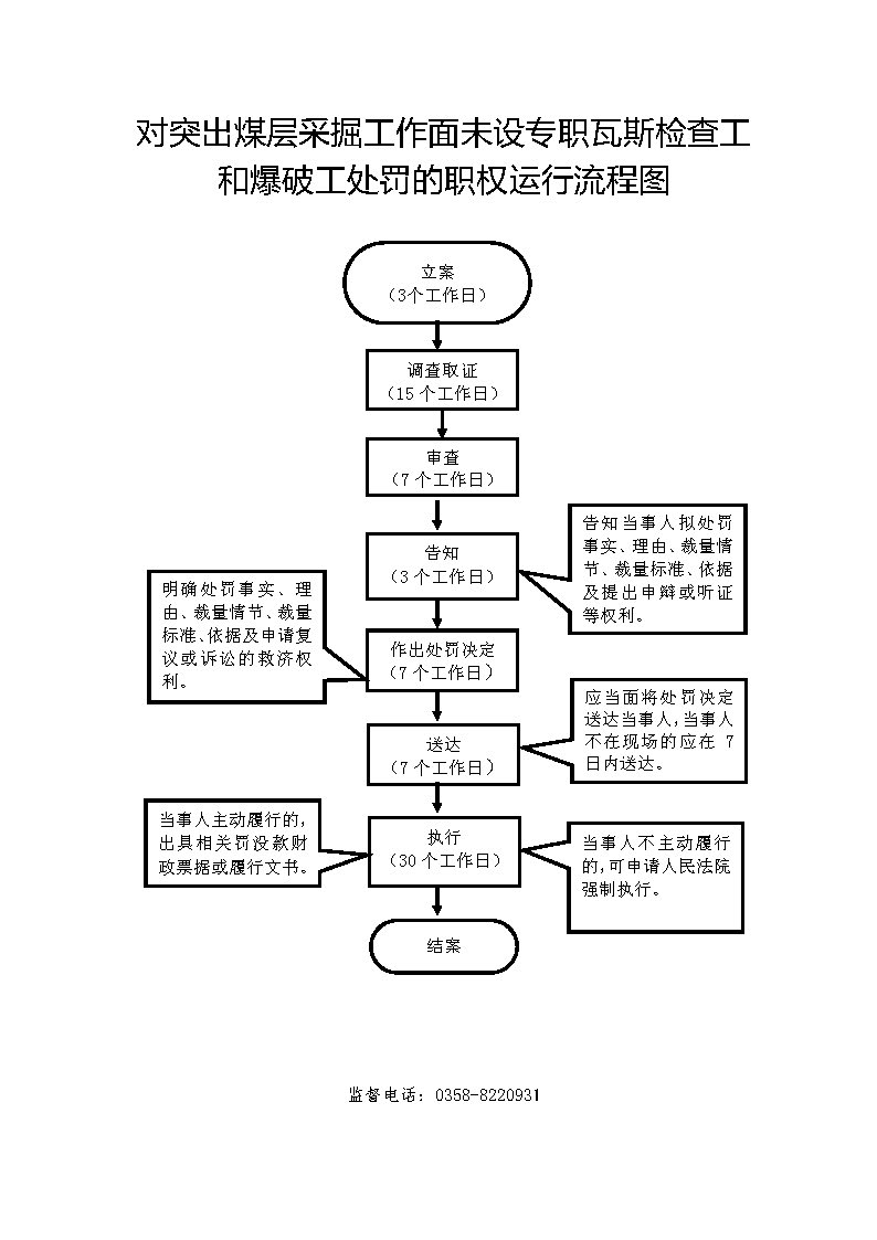 1、立案责任:发现辖区内的煤炭生产经营单位的决策机构、主要负责人或者个人经营的投资人不依照本法规定保证安全生产所必需的资金投入,致使生产经营单位不具备安全生产条件的违法行为(或者下级煤炭管理部门上报或其他机关移送的违法案件等),应及时予以审查,决定是否立案。 2、调查责任:煤炭管理部门对立案的案件,指定专人负责,及时组织调查取证,执法人员应保守有关秘密。 3、审查责任:审理案件调查报告,对案件违法事实、证据、调查取证程序、法律适用、处罚种类和幅度、当事人陈述和申辩理由等方面进行审查,提出处理意见(主要证据不足时,以适当的方式补充调查)。 4、告知责任:作出行政处罚决定前,应制作《行政处罚告知书》送达当事人,告知违法事实及其享有的陈述、申辩等权利。符合听证规定的,制作并送达《行政处罚听证告知书》。 5、决定责任:制作行政处罚决定书,载明行政处罚告知、当事人陈述申辩或者听证情况等内容。 6、送达责任:行政处罚决定书按法律规定的方式送达当事人。 7、执行责任:依照生效的行政处罚决定,监督当事人履行。当事人逾期不履行的,可依法采取加处罚款、申请法院强制执行8、其他法律法规规章文件规定应履行的责任。 |