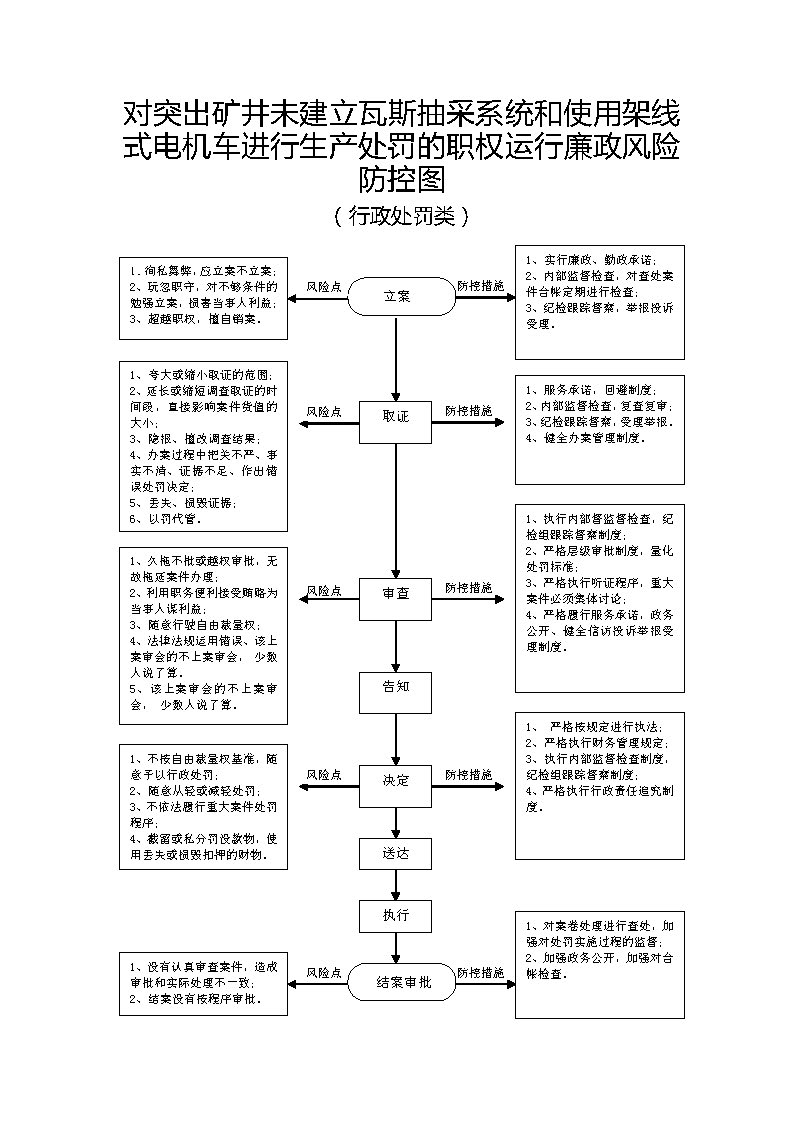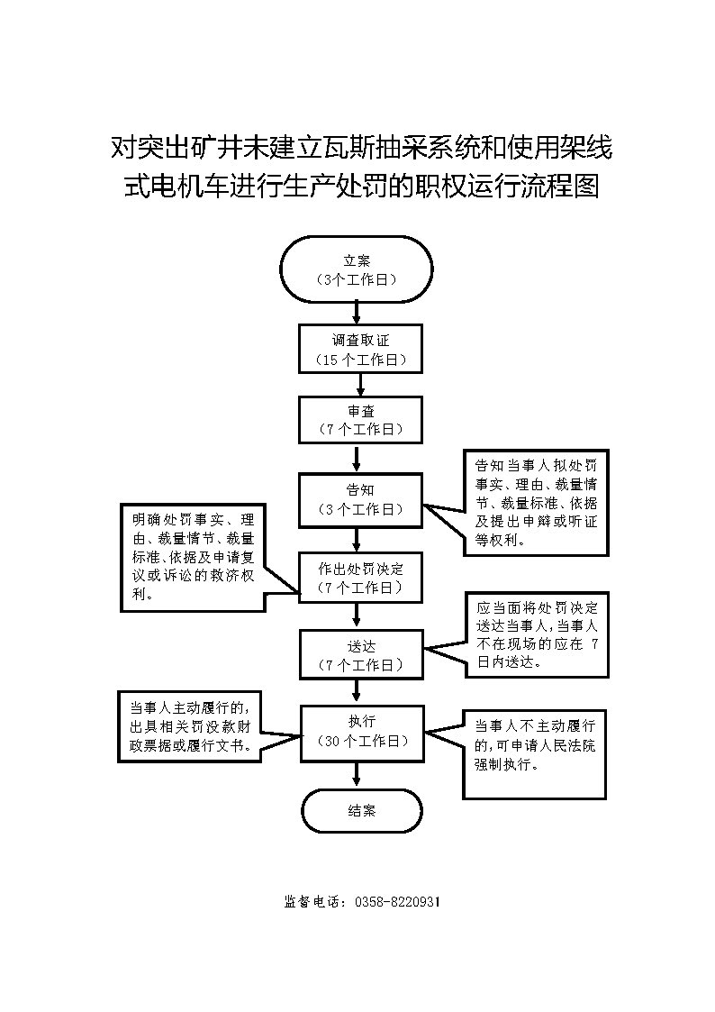 1、立案责任:发现辖区内的煤炭生产经营单位的决策机构、主要负责人或者个人经营的投资人不依照本法规定保证安全生产所必需的资金投入,致使生产经营单位不具备安全生产条件的违法行为(或者下级煤炭管理部门上报或其他机关移送的违法案件等),应及时予以审查,决定是否立案。 2、调查责任:煤炭管理部门对立案的案件,指定专人负责,及时组织调查取证,执法人员应保守有关秘密。 3、审查责任:审理案件调查报告,对案件违法事实、证据、调查取证程序、法律适用、处罚种类和幅度、当事人陈述和申辩理由等方面进行审查,提出处理意见(主要证据不足时,以适当的方式补充调查)。 4、告知责任:作出行政处罚决定前,应制作《行政处罚告知书》送达当事人,告知违法事实及其享有的陈述、申辩等权利。符合听证规定的,制作并送达《行政处罚听证告知书》。 5、决定责任:制作行政处罚决定书,载明行政处罚告知、当事人陈述申辩或者听证情况等内容。 6、送达责任:行政处罚决定书按法律规定的方式送达当事人。 7、执行责任:依照生效的行政处罚决定,监督当事人履行。当事人逾期不履行的,可依法采取加处罚款、申请法院强制执行8、其他法律法规规章文件规定应履行的责任。 |
