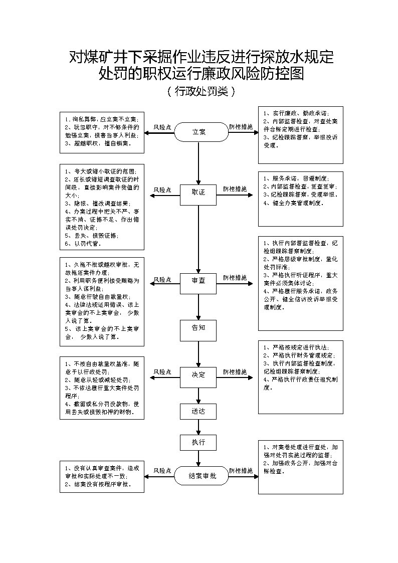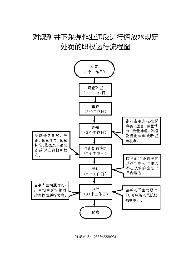 | 行政处罚 | 77671572-4-CF-0037 | 对煤矿井下采掘作业违反探放水规定的处罚 | 【规章】《煤矿防治水规定》(国家安监总局第28号令)第九十二条、第一百三十七条 | 1、立案责任:发现辖区内的煤炭生产经营单位的决策机构、主要负责人或者个人经营的投资人不依照本法规定保证安全生产所必需的资金投入,致使生产经营单位不具备安全生产条件的违法行为(或者下级煤炭管理部门上报或其他机关移送的违法案件等),应及时予以审查,决定是否立案。 2、调查责任:煤炭管理部门对立案的案件,指定专人负责,及时组织调查取证,执法人员应保守有关秘密。 3、审查责任:审理案件调查报告,对案件违法事实、证据、调查取证程序、法律适用、处罚种类和幅度、当事人陈述和申辩理由等方面进行审查,提出处理意见(主要证据不足时,以适当的方式补充调查)。 4、告知责任:作出行政处罚决定前,应制作《行政处罚告知书》送达当事人,告知违法事实及其享有的陈述、申辩等权利。符合听证规定的,制作并送达《行政处罚听证告知书》。 5、决定责任:制作行政处罚决定书,载明行政处罚告知、当事人陈述申辩或者听证情况等内容。 6、送达责任:行政处罚决定书按法律规定的方式送达当事人。 7、执行责任:依照生效的行政处罚决定,监督当事人履行。当事人逾期不履行的,可依法采取加处罚款、申请法院强制执行8、其他法律法规规章文件规定应履行的责任。 |