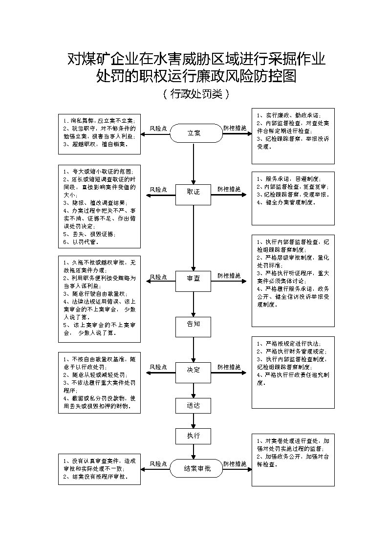 1、立案责任:发现辖区内的煤炭生产经营单位的决策机构、主要负责人或者个人经营的投资人不依照本法规定保证安全生产所必需的资金投入,致使生产经营单位不具备安全生产条件的违法行为(或者下级煤炭管理部门上报或其他机关移送的违法案件等),应及时予以审查,决定是否立案。 2、调查责任:煤炭管理部门对立案的案件,指定专人负责,及时组织调查取证,执法人员应保守有关秘密。 3、审查责任:审理案件调查报告,对案件违法事实、证据、调查取证程序、法律适用、处罚种类和幅度、当事人陈述和申辩理由等方面进行审查,提出处理意见(主要证据不足时,以适当的方式补充调查)。 4、告知责任:作出行政处罚决定前,应制作《行政处罚告知书》送达当事人,告知违法事实及其享有的陈述、申辩等权利。符合听证规定的,制作并送达《行政处罚听证告知书》。 5、决定责任:制作行政处罚决定书,载明行政处罚告知、当事人陈述申辩或者听证情况等内容。 6、送达责任:行政处罚决定书按法律规定的方式送达当事人。 7、执行责任:依照生效的行政处罚决定,监督当事人履行。当事人逾期不履行的,可依法采取加处罚款、申请法院强制执行8、其他法律法规规章文件规定应履行的责任。 |