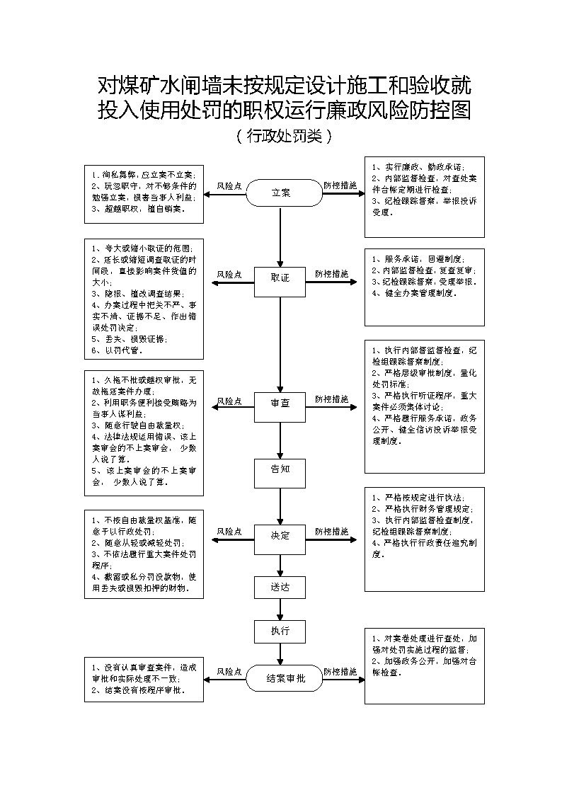 1、立案责任:发现辖区内的煤炭生产经营单位的决策机构、主要负责人或者个人经营的投资人不依照本法规定保证安全生产所必需的资金投入,致使生产经营单位不具备安全生产条件的违法行为(或者下级煤炭管理部门上报或其他机关移送的违法案件等),应及时予以审查,决定是否立案。 2、调查责任:煤炭管理部门对立案的案件,指定专人负责,及时组织调查取证,执法人员应保守有关秘密。 3、审查责任:审理案件调查报告,对案件违法事实、证据、调查取证程序、法律适用、处罚种类和幅度、当事人陈述和申辩理由等方面进行审查,提出处理意见(主要证据不足时,以适当的方式补充调查)。 4、告知责任:作出行政处罚决定前,应制作《行政处罚告知书》送达当事人,告知违法事实及其享有的陈述、申辩等权利。符合听证规定的,制作并送达《行政处罚听证告知书》。 5、决定责任:制作行政处罚决定书,载明行政处罚告知、当事人陈述申辩或者听证情况等内容。 6、送达责任:行政处罚决定书按法律规定的方式送达当事人。 7、执行责任:依照生效的行政处罚决定,监督当事人履行。当事人逾期不履行的,可依法采取加处罚款、申请法院强制执行8、其他法律法规规章文件规定应履行的责任。 |