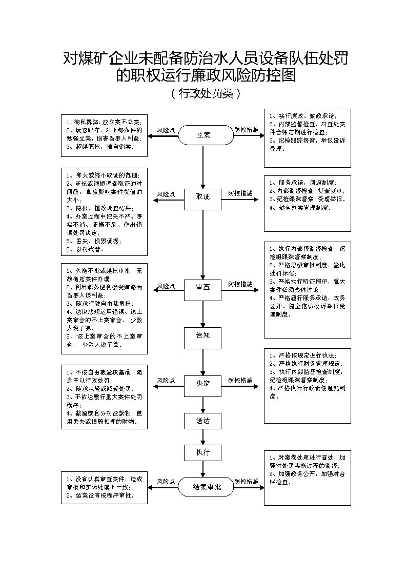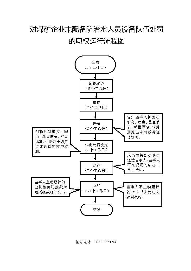 1、立案责任:发现辖区内的煤炭生产经营单位的决策机构、主要负责人或者个人经营的投资人不依照本法规定保证安全生产所必需的资金投入,致使生产经营单位不具备安全生产条件的违法行为(或者下级煤炭管理部门上报或其他机关移送的违法案件等),应及时予以审查,决定是否立案。 2、调查责任:煤炭管理部门对立案的案件,指定专人负责,及时组织调查取证,执法人员应保守有关秘密。 3、审查责任:审理案件调查报告,对案件违法事实、证据、调查取证程序、法律适用、处罚种类和幅度、当事人陈述和申辩理由等方面进行审查,提出处理意见(主要证据不足时,以适当的方式补充调查)。 4、告知责任:作出行政处罚决定前,应制作《行政处罚告知书》送达当事人,告知违法事实及其享有的陈述、申辩等权利。符合听证规定的,制作并送达《行政处罚听证告知书》。 5、决定责任:制作行政处罚决定书,载明行政处罚告知、当事人陈述申辩或者听证情况等内容。 6、送达责任:行政处罚决定书按法律规定的方式送达当事人。 7、执行责任:依照生效的行政处罚决定,监督当事人履行。当事人逾期不履行的,可依法采取加处罚款、申请法院强制执行8、其他法律法规规章文件规定应履行的责任。 |