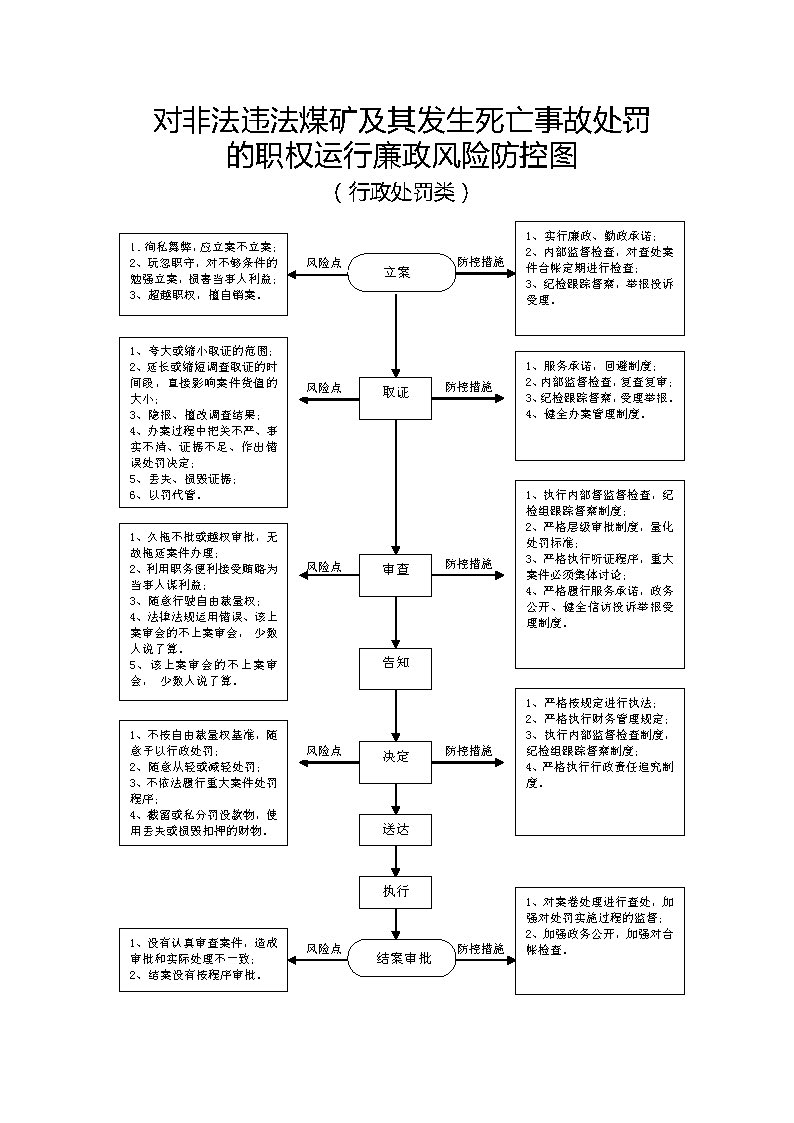 1、立案责任:发现辖区内的煤炭生产经营单位的决策机构、主要负责人或者个人经营的投资人不依照本法规定保证安全生产所必需的资金投入,致使生产经营单位不具备安全生产条件的违法行为(或者下级煤炭管理部门上报或其他机关移送的违法案件等),应及时予以审查,决定是否立案。 2、调查责任:煤炭管理部门对立案的案件,指定专人负责,及时组织调查取证,执法人员应保守有关秘密。 3、审查责任:审理案件调查报告,对案件违法事实、证据、调查取证程序、法律适用、处罚种类和幅度、当事人陈述和申辩理由等方面进行审查,提出处理意见(主要证据不足时,以适当的方式补充调查)。 4、告知责任:作出行政处罚决定前,应制作《行政处罚告知书》送达当事人,告知违法事实及其享有的陈述、申辩等权利。符合听证规定的,制作并送达《行政处罚听证告知书》。 5、决定责任:制作行政处罚决定书,载明行政处罚告知、当事人陈述申辩或者听证情况等内容。 6、送达责任:行政处罚决定书按法律规定的方式送达当事人。 7、执行责任:依照生效的行政处罚决定,监督当事人履行。当事人逾期不履行的,可依法采取加处罚款、申请法院强制执行8、其他法律法规规章文件规定应履行的责任。 |
