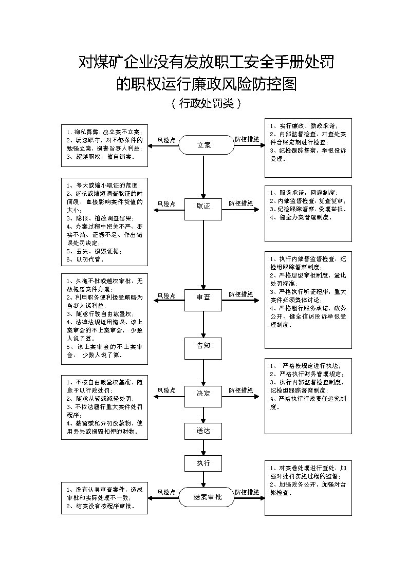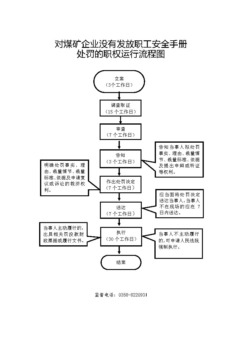 1、立案责任:发现辖区内的煤炭生产经营单位的决策机构、主要负责人或者个人经营的投资人不依照本法规定保证安全生产所必需的资金投入,致使生产经营单位不具备安全生产条件的违法行为(或者下级煤炭管理部门上报或其他机关移送的违法案件等),应及时予以审查,决定是否立案。 2、调查责任:煤炭管理部门对立案的案件,指定专人负责,及时组织调查取证,执法人员应保守有关秘密。 3、审查责任:审理案件调查报告,对案件违法事实、证据、调查取证程序、法律适用、处罚种类和幅度、当事人陈述和申辩理由等方面进行审查,提出处理意见(主要证据不足时,以适当的方式补充调查)。 4、告知责任:作出行政处罚决定前,应制作《行政处罚告知书》送达当事人,告知违法事实及其享有的陈述、申辩等权利。符合听证规定的,制作并送达《行政处罚听证告知书》。 5、决定责任:制作行政处罚决定书,载明行政处罚告知、当事人陈述申辩或者听证情况等内容。 6、送达责任:行政处罚决定书按法律规定的方式送达当事人。 7、执行责任:依照生效的行政处罚决定,监督当事人履行。当事人逾期不履行的,可依法采取加处罚款、申请法院强制执行8、其他法律法规规章文件规定应履行的责任。 |