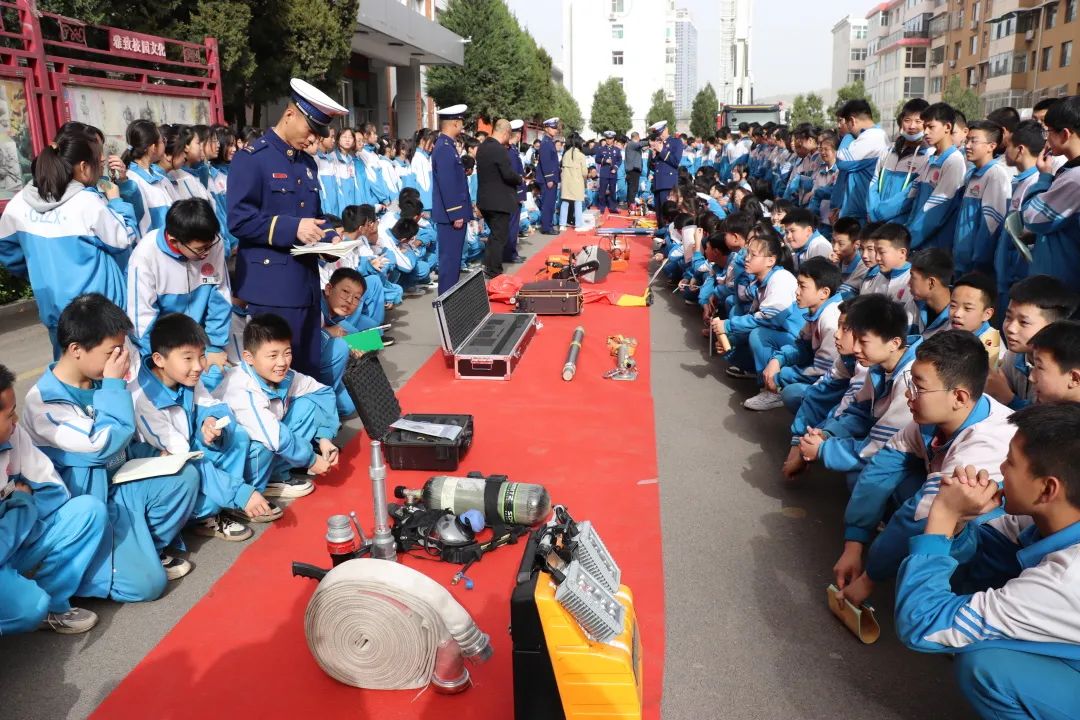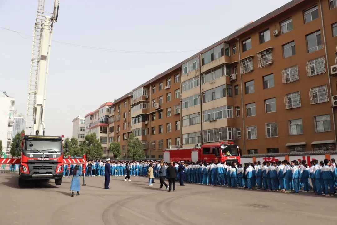 在学校操场,离石区消防救援大队消防指战员们早早等候在此,三辆超大型消防车格外引人注目,师生们来到消防车前,消防指战员为师生讲解了三辆消防车的主要功能和具体用途,同时将个人防护装备、抢险救援装备、破拆工具、担架、逃生绳等消防装备向学生展示,一件件新奇而特别的消防器材引起了学生浓厚的兴趣,消防指战员们详细介绍了各类救援器材的用途和使用方法,并与学生积极互动,使同学们“零距离”感受消防、认识消防,通过讲解,进一步增强了师生的消防安全理念,有效提高师生消防安全意识和应急处置突发事件的能力。