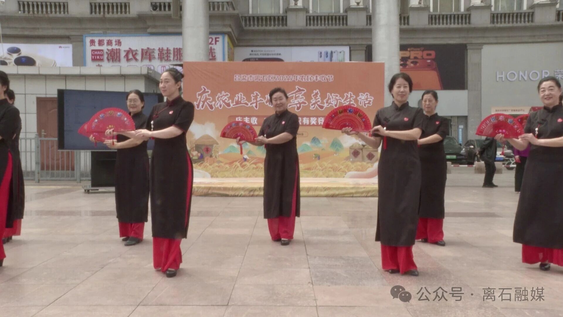 文艺表演活动精彩纷呈。舞台上,演员们伴随着欢快的音乐翩翩起舞,以扇子为道具,巧妙地编排动作,将丰收的欢乐氛围演绎得淋漓尽致。整齐划一的舞步、灵动的身姿,展现出了农民们在丰收时节的喜悦心情,引得台下观众阵阵掌声。