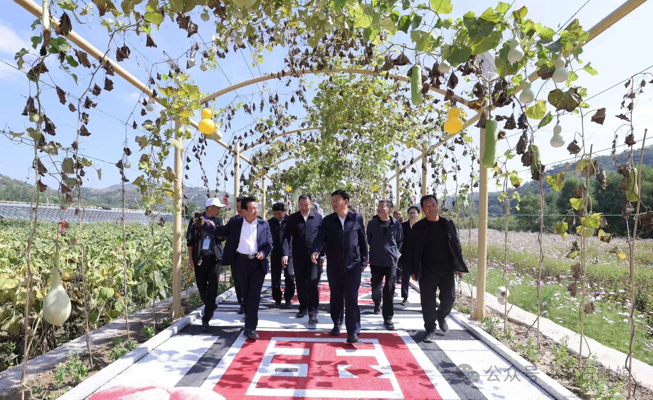 廉海平一行人行走在葫芦观光园里,藤蔓上挂满了形态各异、玲珑可爱的葫芦,它们在微风中轻轻摇曳,仿佛是在欢迎每一位来访者。