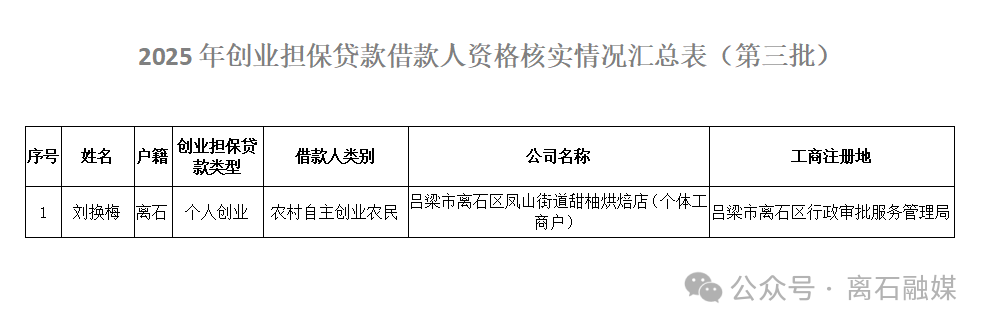 根据《关于转发山西省人力资源和社会保障厅<关于进一步做好创业担保贷款借款人资格核实工作的通知>的通知》(吕人社函〔2020〕254号)文件精神,我中心对离石区申请创业担保贷款借款的刘换梅1人进行了资格初步核实,现将已核实的申请创业担保贷款借款人资格的有关信息予以公示,接受社会监督,公示期为5个工作日(2025年10月27日至2025年10月31日)。