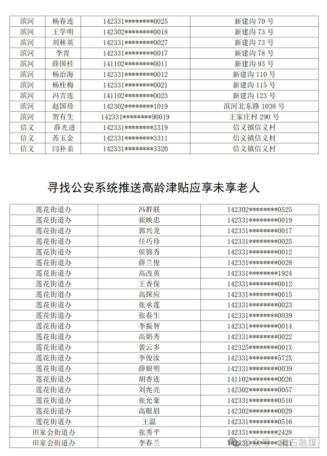 为更好的落实80周岁及以上老年人高龄津贴政策,区民政局与公安比对、村(社区)网格员走访排查及经2026年1月在离石区人民政府官网和离石融媒等载体发公告以来,现全区仍有464名80周岁及以上老年人(名单附后)联系不到,为保障好高龄老年人相关合法权益,望看到此公告的高龄老年人、家属及亲朋好友,速与户籍地乡镇(街道)民政助理员联系(咨询电话附后),以便更好的落实高龄津贴政策。